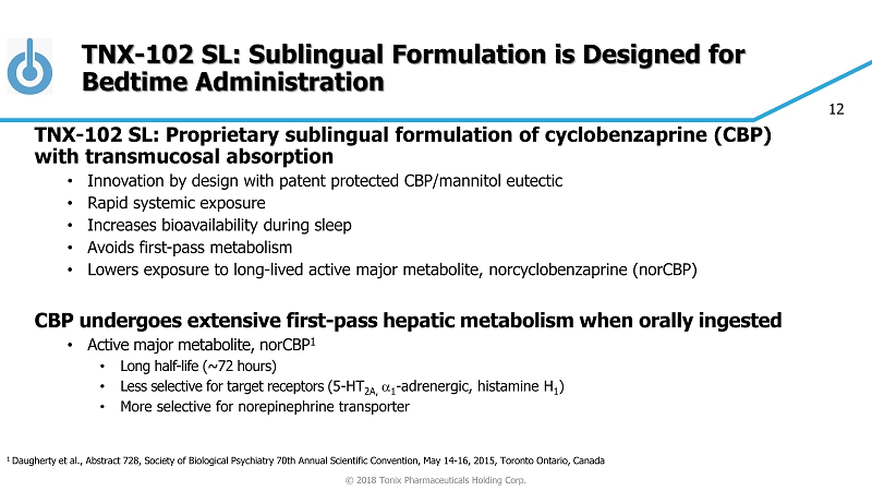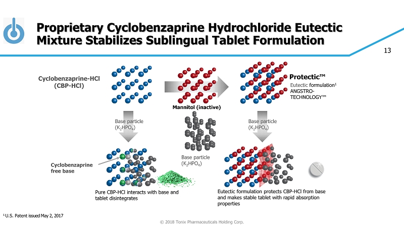 © 2018 Tonix Pharmaceuticals Holding Corp. 12 TNX - 102 SL: Sublingual Formulation is Designed for Bedtime Administration TNX - 102 SL: Proprietary sublingual formulation of cyclobenzaprine (CBP) with transmucosal absorption • Innovation by design with patent protected CBP/mannitol eutectic • Rapid systemic exposure • Increases bioavailability during sleep • Avoids first - pass metabolism • Lowers exposure to long - lived active major metabolite, norcyclobenzaprine ( norCBP ) CBP undergoes extensive first - pass hepatic metabolism when orally ingested • Active major metabolite, norCBP 1 • Long half - life (~72 hours) • Less selective for target receptors ( 5 - HT 2A, a 1 - adrenergic, histamine H 1 ) • More selective for norepinephrine transporter 1 Daugherty et al., Abstract 728, Society of Biological Psychiatry 70th Annual Scientific Convention, May 14 - 16, 2015, Toronto Ont ario, Canada
