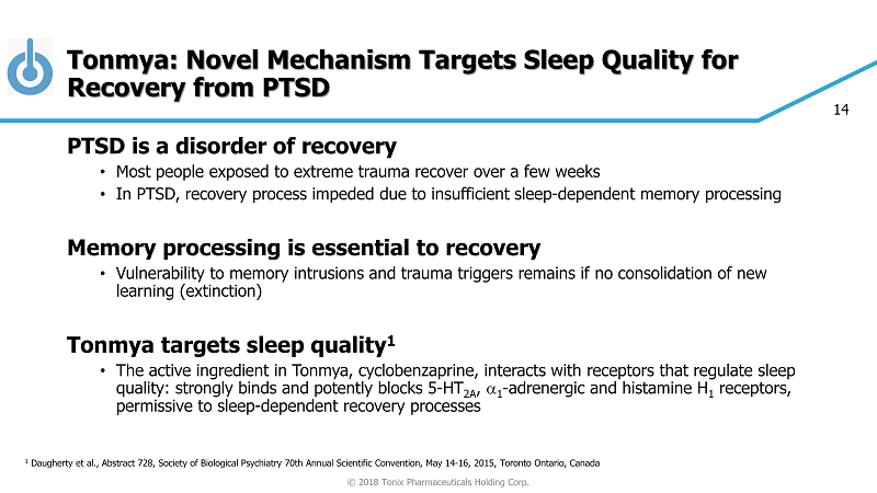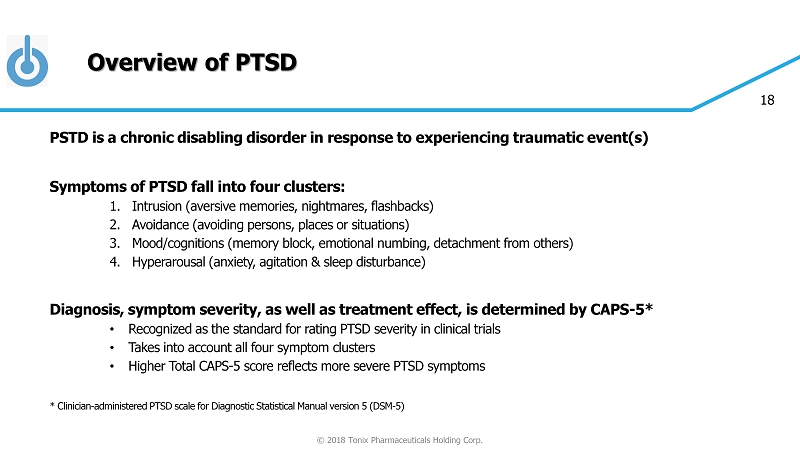 © 2018 Tonix Pharmaceuticals Holding Corp. 17 Fear Extinction Memory Consolidation: The Proposed Role of P - Waves, REM Sleep, and Serotonergic Neuroreceptor Activity Serotonergic projections from the dorsal raphe nuclei pons Site of release of phasic waves called pontine or P - waves P - wave activity is highest right before and during REM sleep 1 • Serotonergic activity normally inhibits P - wave release during REM sleep 2 • This is thought to be done primarily through activity at 5 - HT 2A receptors 3 • Increased P - wave activity during REM sleep is critical for fear extinction memory consolidation in rats 4 • By blocking 5 - HT 2A receptors, cyclobenzaprine may sustain P - wave activity during REM sleep • This blockade may lead to better quality of REM sleep with increased fear extinction consolidation in individuals with PTSD, facilitating recovery P - waves, ponto - geniculo - occipital waves; REM, rapid eye movement 1. Lim AS, et al. Sleep . 2007;30(7):823 - 827. 2. Datta S, et al. Sleep . 2003;26(5):513 - 520. 3. Tamas K, Gyorgy B. Effect of 5 - HT2A/2B/2C receptor agonists and antagonists on sleep and waking in laboratory animals and humans . In: Monti JM, Pandi - Perumal SR, Jacobs BL, Nutt DJ, eds. Serotonin and sleep: Molecular, functional, and clinical aspects. Basel, Sw itzerland: Birkhäuser Basel; 2008. 4. Datta S, et al. J Neurosci . 2013;33(10):4561 - 4569.