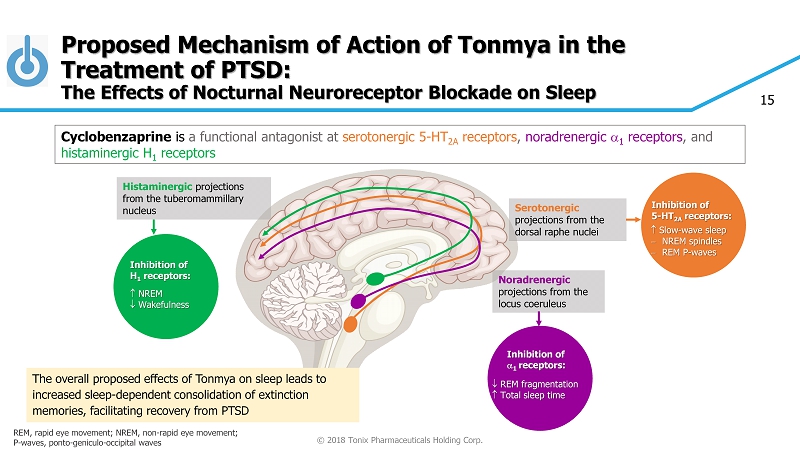 © 2018 Tonix Pharmaceuticals Holding Corp. 14 Tonmya: Novel Mechanism Targets Sleep Quality for Recovery from PTSD PTSD is a disorder of recovery • Most people exposed to extreme trauma recover over a few weeks • In PTSD, recovery process impeded due to insufficient sleep - dependent memory processing Memory processing is essential to recovery • Vulnerability to memory intrusions and trauma triggers remains if no consolidation of new learning (extinction) Tonmya targets sleep quality 1 • The active ingredient in Tonmya, cyclobenzaprine, interacts with receptors that regulate sleep quality: strongly binds and potently blocks 5 - HT 2A , a 1 - adrenergic and histamine H 1 receptors, permissive to sleep - dependent recovery processes 1 Daugherty et al., Abstract 728, Society of Biological Psychiatry 70th Annual Scientific Convention, May 14 - 16, 2015, Toronto On tario, Canada