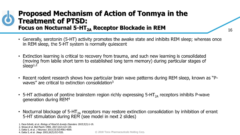 © 2018 Tonix Pharmaceuticals Holding Corp. 15 Proposed Mechanism of Action of Tonmya in the Treatment of PTSD: The Effects of Nocturnal Neuroreceptor Blockade on Sleep Cyclobenzaprine is a functional antagonist at serotonergic 5 - HT 2A receptors , noradrenergic 1 receptors , and histaminergic H 1 receptors REM, rapid eye movement; NREM, non - rapid eye movement; P - waves, ponto - geniculo - occipital waves Serotonergic projections from the dorsal raphe nuclei Inhibition of 5 - HT 2A receptors: Slow - wave sleep NREM spindles REM P - waves Noradrenergic projections from the locus coeruleus Inhibition of 1 receptors: REM fragmentation Total sleep time Histaminergic projections from the tuberomammillary nucleus Inhibition of H 1 receptors: NREM Wakefulness The overall proposed effects of Tonmya on sleep leads to increased sleep - dependent consolidation of extinction memories, facilitating recovery from PTSD