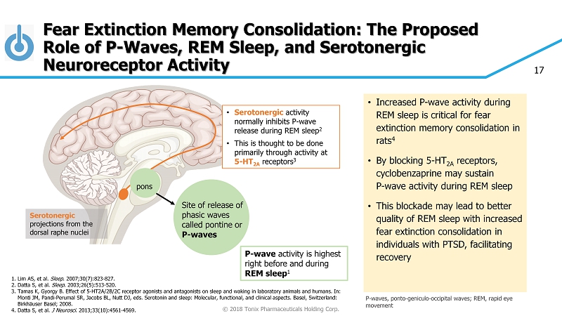 © 2018 Tonix Pharmaceuticals Holding Corp. 16 • Generally, serotonin (5 - HT) activity promotes the awake state and inhibits REM sleep; whereas once in REM sleep, the 5 - HT system is normally quiescent • Extinction learning is critical to recovery from trauma, and such new learning is consolidated (moving from labile short term to established long term memory) during particular stages of sleep 1,2 • Recent rodent research shows how particular brain wave patterns during REM sleep, known as “P - waves” are critical to extinction consolidation 3 • 5 - HT activation of pontine brainstem region richly expressing 5 - HT 2A receptors inhibits P - wave generation during REM 4 • Nocturnal blockage of 5 - HT 2A receptors may restore extinction consolidation by inhibition of errant 5 - HT stimulation during REM (see model in next 2 slides) Proposed Mechanism of Action of Tonmya in the Treatment of PTSD: Focus on Nocturnal 5 - HT 2A Receptor Blockade in REM 1. Pace - Schott, et al. Biology of Mood & Anxiety Disorders . 2015;5(3):1 - 19. 2. Straus et al. Biol Psych: CNNI. 2017;2(2):123 - 129. 3. Datta S, et al. J Neurosci . 2013;33(10):4561 - 4569. 4. Datta S, et al. Sleep . 2003;26(5):513 - 520.