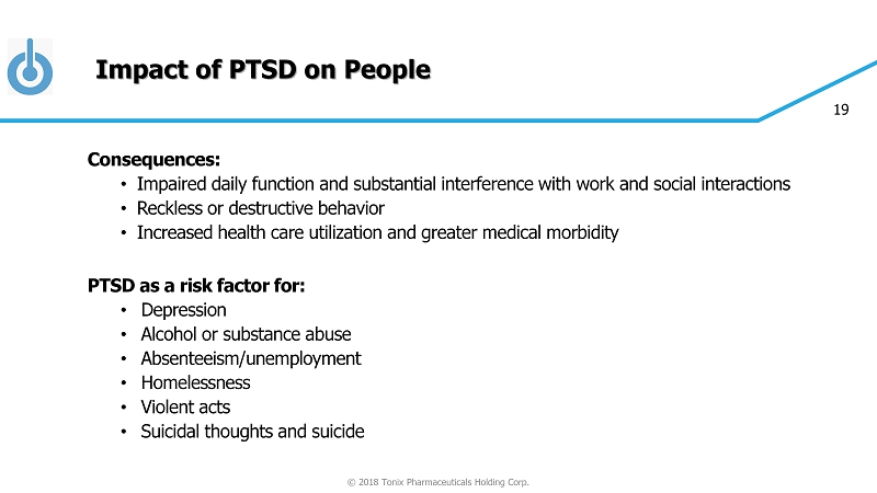 © 2018 Tonix Pharmaceuticals Holding Corp. 18 Overview of PTSD PSTD is a chronic disabling disorder in response to experiencing traumatic event(s) Symptoms of PTSD fall into four clusters: 1. Intrusion (aversive memories, nightmares, flashbacks) 2. Avoidance (avoiding persons, places or situations) 3. Mood/cognitions (memory block, emotional numbing, detachment from others) 4. Hyperarousal (anxiety, agitation & sleep disturbance) Diagnosis, symptom severity, as well as treatment effect, is determined by CAPS - 5* • Recognized as the standard for rating PTSD severity in clinical trials • Takes into account all four symptom clusters • Higher Total CAPS - 5 score reflects more severe PTSD symptoms * Clinician - administered PTSD scale for Diagnostic Statistical Manual version 5 (DSM - 5)