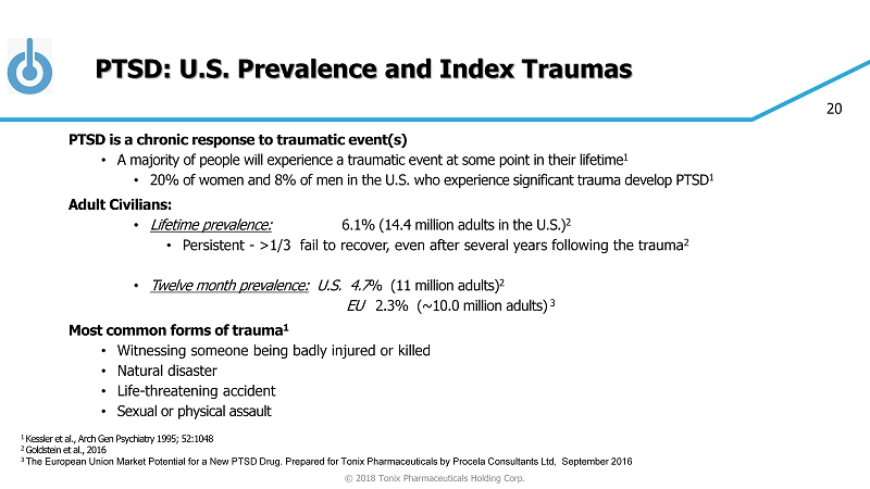 © 2018 Tonix Pharmaceuticals Holding Corp. 19 Impact of PTSD on People Consequences: • Impaired daily function and substantial interference with work and social interactions • Reckless or destructive behavior • Increased health care utilization and greater medical morbidity PTSD as a risk factor for: • Depression • Alcohol or substance abuse • Absenteeism/unemployment • Homelessness • Violent acts • Suicidal thoughts and suicide