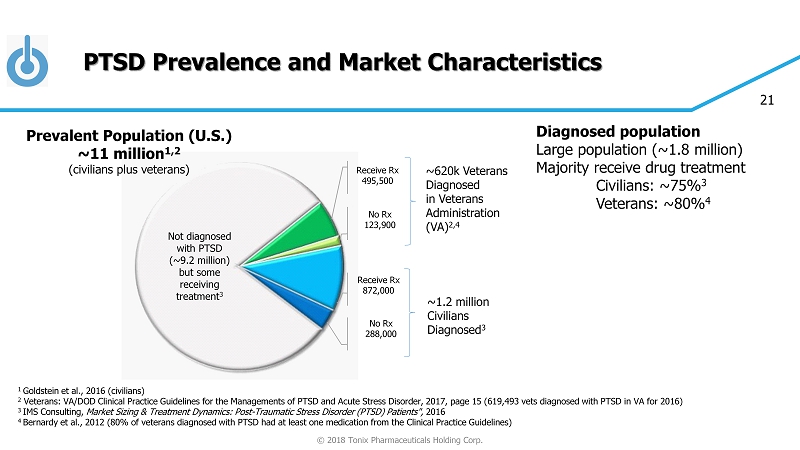 © 2018 Tonix Pharmaceuticals Holding Corp. 20 PTSD: U.S. Prevalence and Index Traumas PTSD is a chronic response to traumatic event(s) • A majority of people will experience a traumatic event at some point in their lifetime 1 • 20% of women and 8% of men in the U.S. who experience significant trauma develop PTSD 1 Adult Civilians: • Lifetime prevalence: 6.1% (14.4 million adults in the U.S.) 2 • Persistent - >1/3 fail to recover, even after several years following the trauma 2 • Twelve month prevalence: U.S. 4.7 % (11 million adults) 2 EU 2.3% (~10.0 million adults) 3 Most common forms of trauma 1 • Witnessing someone being badly injured or killed • Natural disaster • Life - threatening accident • Sexual or physical assault 1 Kessler et al., Arch Gen Psychiatry 1995; 52:1048 2 Goldstein et al., 2016 3 The European Union Market Potential for a New PTSD Drug. Prepared for Tonix Pharmaceuticals by Procela Consultants Ltd, Sept emb er 2016