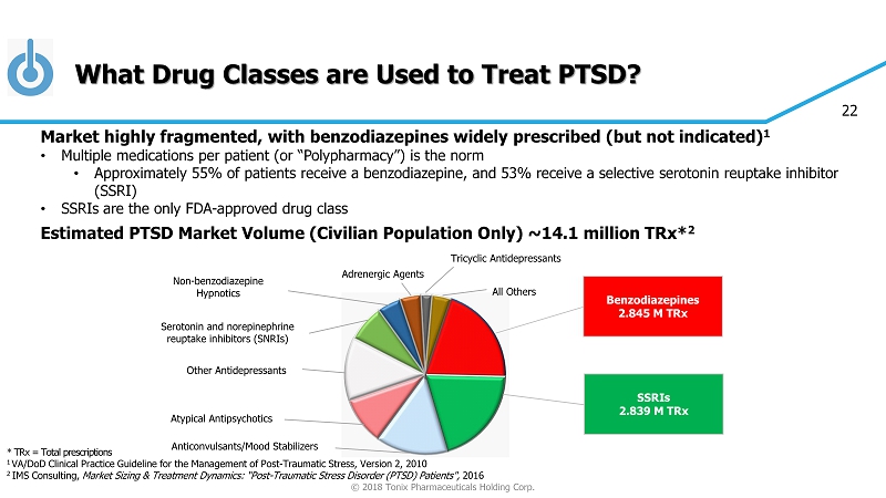 © 2018 Tonix Pharmaceuticals Holding Corp. 21 PTSD Prevalence and Market Characteristics 1 Goldstein et al., 2016 (civilians) 2 Veterans: VA/DOD Clinical Practice Guidelines for the Managements of PTSD and Acute Stress Disorder, 2017, page 15 (619,493 v et s diagnosed with PTSD in VA for 2016) 3 IMS Consulting, Market Sizing & Treatment Dynamics: Post - Traumatic Stress Disorder (PTSD) Patients", 2016 4 Bernardy et al., 2012 (80% of veterans diagnosed with PTSD had at least one medication from the Clinical Practice Guidelines) ~620k Veterans Diagnosed in Veterans Administration (VA) 2,4 ~1.2 million Civilians Diagnosed 3 Diagnosed population Large population (~1.8 million) Majority receive drug treatment Civilians: ~75% 3 Veterans: ~80% 4 Not diagnosed with PTSD (~9.2 million) but some receiving treatment 3 Prevalent Population (U.S.) ~11 million 1,2 (civilians plus veterans) Receive Rx 495,500 No Rx 123,900 Receive Rx 872,000 No Rx 288,000