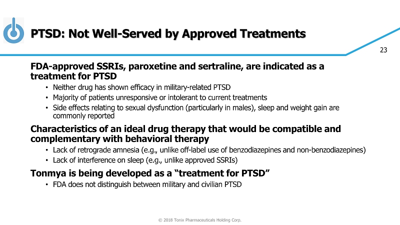 © 2018 Tonix Pharmaceuticals Holding Corp. 22 What Drug Classes are Used to Treat PTSD? * TRx = Total prescriptions 1 VA/DoD Clinical Practice Guideline for the Management of Post - Traumatic Stress, Version 2, 2010 2 IMS Consulting, Market Sizing & Treatment Dynamics: “Post - Traumatic Stress Disorder (PTSD) Patients", 2016 Benzodiazepines 2.845 M TRx SSRIs 2.839 M TRx Other Antidepressants Non - benzodiazepine Hypnotics Serotonin and norepinephrine reuptake inhibitors (SNRIs) Tricyclic Antidepressants Adrenergic Agents All Others Atypical Antipsychotics Anticonvulsants/Mood Stabilizers Market highly fragmented, with benzodiazepines widely prescribed (but not indicated) 1 • Multiple medications per patient (or “Polypharmacy”) is the norm • Approximately 55% of patients receive a benzodiazepine, and 53% receive a selective serotonin reuptake inhibitor (SSRI) • SSRIs are the only FDA - approved drug class Estimated PTSD Market Volume (Civilian Population Only) ~14.1 million TRx * 2