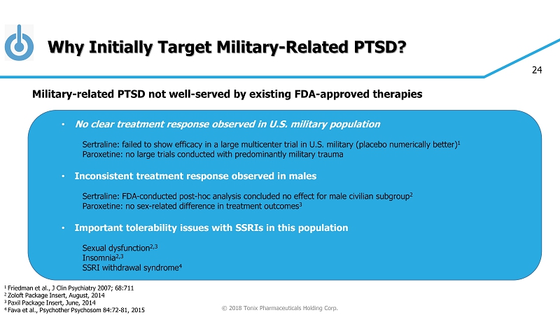 © 2018 Tonix Pharmaceuticals Holding Corp. 23 PTSD: Not Well - Served by Approved Treatments FDA - approved SSRIs, paroxetine and sertraline, are indicated as a treatment for PTSD • Neither drug has shown efficacy in military - related PTSD • Majority of patients unresponsive or intolerant to current treatments • Side effects relating to sexual dysfunction (particularly in males), sleep and weight gain are commonly reported Characteristics of an ideal drug therapy that would be compatible and complementary with behavioral therapy • Lack of retrograde amnesia (e.g., unlike off - label use of benzodiazepines and non - benzodiazepines) • Lack of interference on sleep (e.g., unlike approved SSRIs) Tonmya is being developed as a “treatment for PTSD” • FDA does not distinguish between military and civilian PTSD