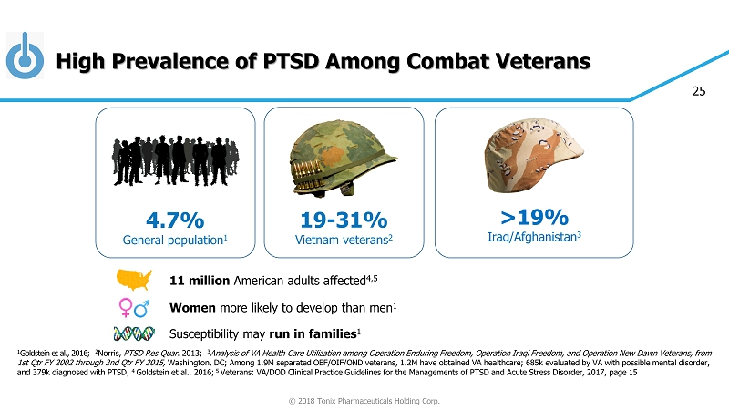© 2018 Tonix Pharmaceuticals Holding Corp. 24 Why Initially Target Military - Related PTSD? 1 Friedman et al., J Clin Psychiatry 2007; 68:711 2 Zoloft Package Insert, August, 2014 3 Paxil Package Insert, June, 2014 4 Fava et al., Psychother Psychosom 84:72 - 81, 2015 Military - related PTSD not well - served by existing FDA - approved therapies • No clear treatment response observed in U.S. military population Sertraline: failed to show efficacy in a large multicenter trial in U.S. military (placebo numerically better) 1 Paroxetine: no large trials conducted with predominantly military trauma • Inconsistent treatment response observed in males Sertraline: FDA - conducted post - hoc analysis concluded no effect for male civilian subgroup 2 Paroxetine: no sex - related difference in treatment outcomes 3 • Important tolerability issues with SSRIs in this population Sexual dysfunction 2,3 Insomnia 2,3 SSRI withdrawal syndrome 4