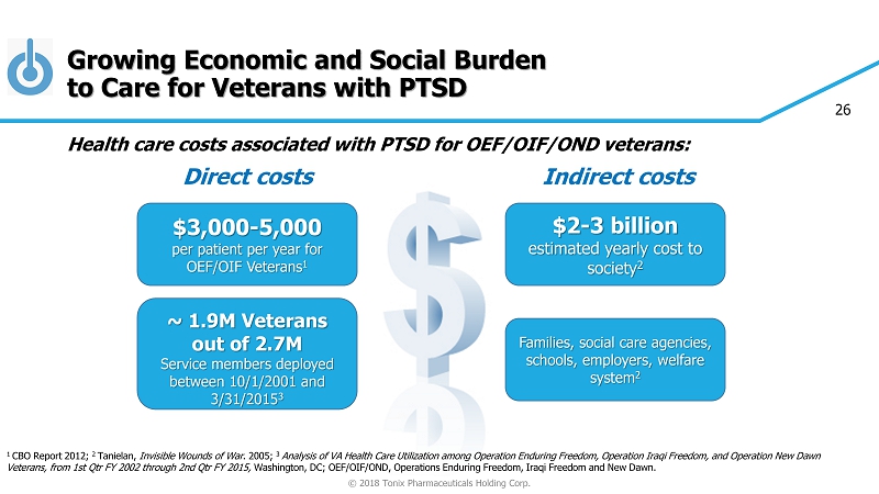 © 2018 Tonix Pharmaceuticals Holding Corp. 25 High Prevalence of PTSD Among Combat Veterans 1 Goldstein et al., 2016 ; 2 Norris, PTSD Res Quar . 2013; 3 Analysis of VA Health Care Utilization among Operation Enduring Freedom, Operation Iraqi Freedom, and Operation New Dawn Vete ran s, from 1st Qtr FY 2002 through 2nd Qtr FY 2015, Washington, DC ; Among 1.9M separated OEF/OIF/OND veterans, 1.2M have obtained VA healthcare; 685k evaluated by VA with possible mental diso rde r, and 379k diagnosed with PTSD; 4 Goldstein et al., 2016; 5 Veterans: VA/DOD Clinical Practice Guidelines for the Managements of PTSD and Acute Stress Disorder, 2017, page 15 >19% Iraq/Afghanistan 3 4.7% General population 1 19 - 31% Vietnam veterans 2 11 million American adults affected 4,5 Women more likely to develop than men 1 Susceptibility may run in families 1