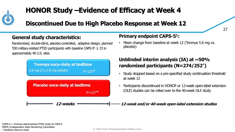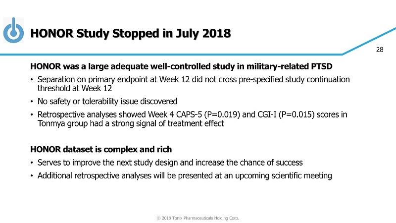 © 2018 Tonix Pharmaceuticals Holding Corp. 27 HONOR Study – Evidence of Efficacy at Week 4 Discontinued Due to High Placebo Response at Week 12 Primary e ndpoint CAPS - 5 1 : • Mean change from baseline at w eek 12 (Tonmya 5.6 mg vs. placebo ) Unblinded interim analysis (IA) at ~50% randomized participants (N=274/252 * ) • Study stopped based on a pre - specified study continuation threshold at week 12 • Participants discontinued in HONOR or 12 - week open - label extension (OLE) studies can be rolled over to the 40 - week OLE study Placebo once - daily at bedtime 12 - weeks Tonmya once - daily at bedtime n= 127 * n= 125 * 5.6 mg (2 x 2.8 mg tablets) General s tudy c haracteristics: Randomized, double - blind, placebo - controlled , adaptive design, planned 550 military - related PTSD participants with baseline CAPS - 5 1 ≥ 33 in approximately 40 U.S. sites 1 CAPS - 5 = Clinician - Administered PTSD Scale for DSM - 5 2 IDMC=Independent Data Monitoring Committee * Modified intent - to - treat 12 - week and/or 40 - week open - label extension studies