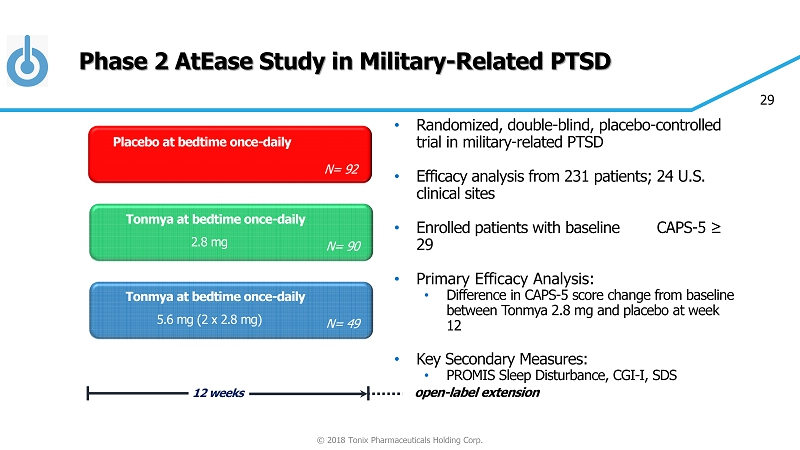 © 2018 Tonix Pharmaceuticals Holding Corp. 28 HONOR Study Stopped in July 2018 HONOR was a large adequate well - controlled study in military - related PTSD • Separation on primary endpoint at Week 12 did not cross pre - specified study continuation threshold at Week 12 • No safety or tolerability issue discovered • Retrospective analyses showed Week 4 CAPS - 5 (P=0.019) and CGI - I (P=0.015) scores in Tonmya group had a strong signal of treatment effect HONOR dataset is complex and rich • Serves to improve the next study design and increase the chance of success • Additional retrospective analyses will be presented at an upcoming scientific meeting