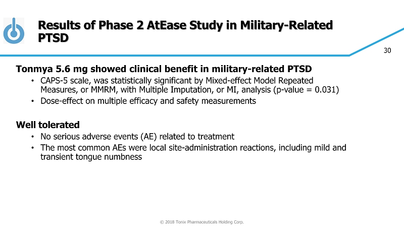 © 2018 Tonix Pharmaceuticals Holding Corp. 29 Phase 2 AtEase Study in Military - Related PTSD • Randomized, double - blind, placebo - controlled trial in military - related PTSD • Efficacy analysis from 231 patients; 24 U.S. clinical sites • Enrolled patients with baseline CAPS - 5 ≥ 29 • Primary Efficacy Analysis: • Difference in CAPS - 5 score change from baseline between Tonmya 2.8 mg and placebo at week 12 • Key Secondary Measures: • PROMIS Sleep Disturbance, CGI - I, SDS Tonmya at bedtime once - daily Placebo at bedtime once - daily 12 weeks N= 90 Tonmya at bedtime once - daily N= 92 N= 49 2.8 mg 5.6 mg (2 x 2.8 mg) open - label extension