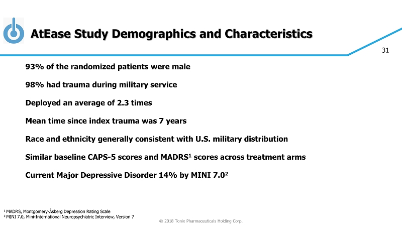 © 2018 Tonix Pharmaceuticals Holding Corp. 30 Results of Phase 2 AtEase Study in Military - Related PTSD Tonmya 5.6 mg showed clinical benefit in military - related PTSD • CAPS - 5 scale, was statistically significant by Mixed - effect Model Repeated Measures, or MMRM, with Multiple Imputation, or MI, analysis (p - value = 0.031) • Dose - effect on multiple efficacy and safety measurements Well tolerated • No serious adverse events (AE) related to treatment • The most common AEs were local site - administration reactions, including mild and transient tongue numbness