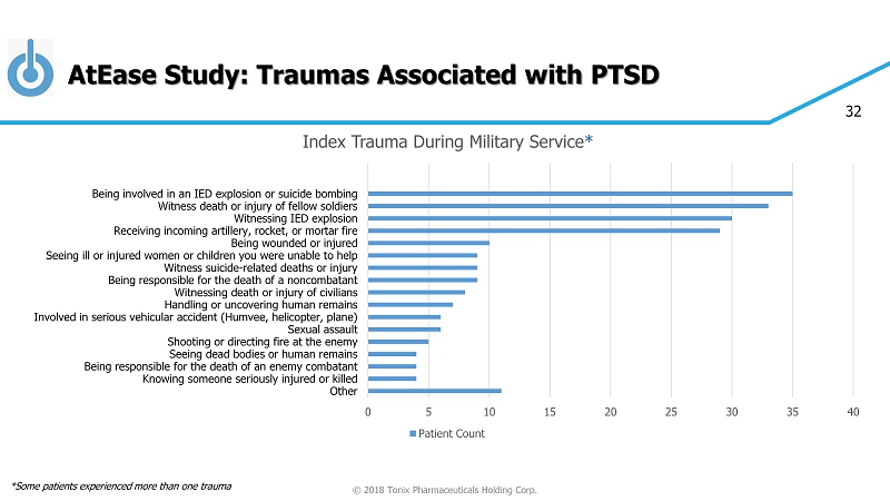 © 2018 Tonix Pharmaceuticals Holding Corp. 31 AtEase Study Demographics and Characteristics 93% of the randomized patients were male 98% had trauma during military service Deployed an average of 2.3 times Mean time since index trauma was 7 years Race and ethnicity generally consistent with U.S. military distribution Similar baseline CAPS - 5 scores and MADRS 1 scores across treatment arms Current Major Depressive Disorder 14% by MINI 7.0 2 1 MADRS, Montgomery - Åsberg Depression Rating Scale 2 MINI 7.0, Mini - International Neuropsychiatric Interview, Version 7