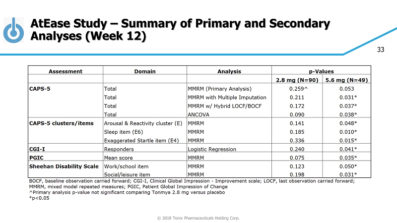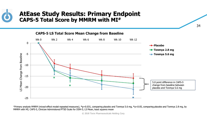 © 2018 Tonix Pharmaceuticals Holding Corp. 33 AtEase Study – Summary of Primary and Secondary Analyses (Week 12)