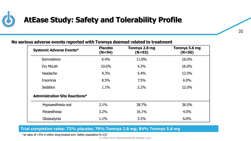 © 2018 Tonix Pharmaceuticals Holding Corp. 34 AtEase Study Results: Primary Endpoint CAPS - 5 Total Score by MMRM with MI # -25 -20 -15 -10 -5 0 Wk 0 Wk 2 Wk 4 Wk 6 Wk 8 Wk 10 Wk 12 Placebo Tonmya 2.8 mg Tonmya 5.6 mg * # Primary analysis MMRM (mixed - effect model repeated measures), * p=0.031, comparing placebo and Tonmya 5.6 mg, * p<0.05, comparing placebo and Tonmya 2.8 mg, by MMRM with MI; CAPS - 5, Clinician Administered PTSD Scale for DSM - 5; LS Mean, least squares mean * * CAPS - 5 LS Total Score Mean Change from Baseline 5.0 point difference in CAPS - 5 change from baseline between placebo and Tonmya 5.6 mg LS Mean Change from Baseline