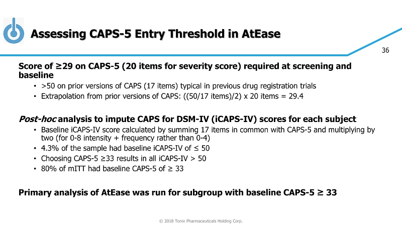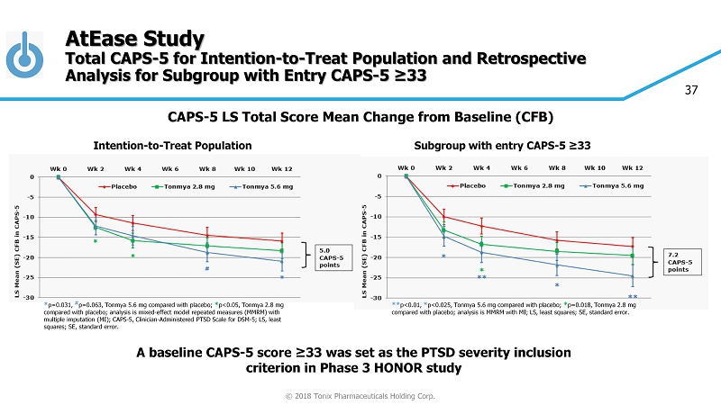 © 2018 Tonix Pharmaceuticals Holding Corp. 36 Assessing CAPS - 5 Entry Threshold in AtEase Score of ≥29 on CAPS - 5 (20 items for severity score) required at screening and baseline • >50 on prior versions of CAPS (17 items) typical in previous drug registration trials • Extrapolation from prior versions of CAPS: ((50/17 items)/2) x 20 items = 29.4 Post - hoc analysis to impute CAPS for DSM - IV ( iCAPS - IV) scores for each subject • Baseline iCAPS - IV score calculated by summing 17 items in common with CAPS - 5 and multiplying by two (for 0 - 8 intensity + frequency rather than 0 - 4) • 4.3% of the sample had baseline iCAPS - IV of ≤ 50 • Choosing CAPS - 5 ≥33 results in all iCAPS - IV > 50 • 80% of mITT had baseline CAPS - 5 of ≥ 33 Primary analysis of AtEase was run for subgroup with baseline CAPS - 5 ≥ 33