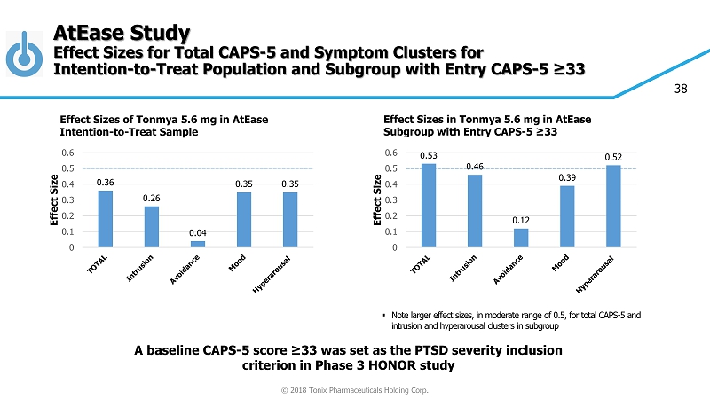 © 2018 Tonix Pharmaceuticals Holding Corp. 37 AtEase Study Total CAPS - 5 for Intention - to - Treat Population and Retrospective Analysis for Subgroup with Entry CAPS - 5 ≥33 A baseline CAPS - 5 score ≥33 was set as the PTSD severity inclusion criterion in Phase 3 HONOR study Intention - to - Treat Population Subgroup with entry CAPS - 5 ≥33 CAPS - 5 LS Total Score Mean Change from Baseline (CFB) * p=0.031, # p=0.063, Tonmya 5.6 mg compared with placebo; * p<0.05, Tonmya 2.8 mg compared with placebo; analysis is mixed - effect model repeated measures ( MMRM) with multiple imputation (MI) ; CAPS - 5, Clinician - Administered PTSD Scale for DSM - 5; LS, least squares; SE, standard error. ** p<0.01, * p<0.025, Tonmya 5.6 mg compared with placebo; * p=0.018, Tonmya 2.8 mg compared with placebo; analysis is MMRM with MI ; LS, least squares; SE, standard error.