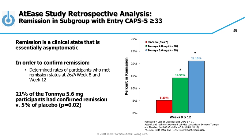 © 2018 Tonix Pharmaceuticals Holding Corp. 38 0.53 0.46 0.12 0.39 0.52 0 0.1 0.2 0.3 0.4 0.5 0.6 Effect Size AtEase Study Effect Sizes for Total CAPS - 5 and Symptom Clusters for Intention - to - Treat Population and Subgroup with Entry CAPS - 5 ≥33 Effect Sizes in Tonmya 5.6 mg in AtEase Subgroup with Entry CAPS - 5 ≥33 0.36 0.26 0.04 0.35 0.35 0 0.1 0.2 0.3 0.4 0.5 0.6 Effect Size Effect Sizes of Tonmya 5.6 mg in AtEase Intention - to - Treat Sample ▪ Note larger effect sizes, in moderate range of 0.5, for total CAPS - 5 and intrusion and hyperarousal clusters in subgroup A baseline CAPS - 5 score ≥33 was set as the PTSD severity inclusion criterion in Phase 3 HONOR study