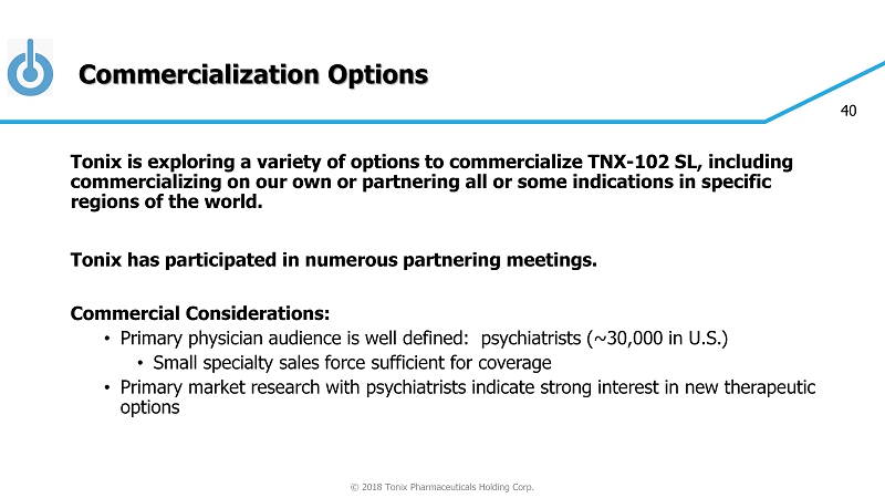 © 2018 Tonix Pharmaceuticals Holding Corp. 40 Commercialization Options Tonix is exploring a variety of options to commercialize TNX - 102 SL, including commercializing on our own or partnering all or some indications in specific regions of the world. Tonix has participated in numerous partnering meetings. Commercial Considerations: • Primary physician audience is well defined: psychiatrists (~30,000 in U.S.) • Small specialty sales force sufficient for coverage • Primary market research with psychiatrists indicate strong interest in new therapeutic options