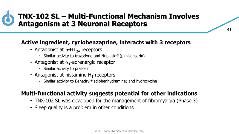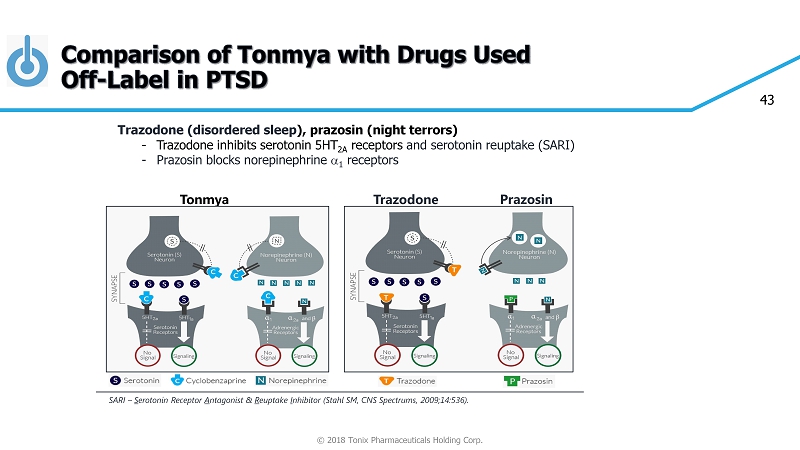 © 2018 Tonix Pharmaceuticals Holding Corp. 42 Untreated Effects of TNX - 102 Cyclobenzaprine is a multi - functional drug - SNARI - inhibits serotonin and norepinephrine reuptake - blocks serotonin 5 - HT 2A and norepinephrine a 1 receptors SNARI = S erotonin and N orepinephrine receptor A ntagonist and R euptake I nhibitor