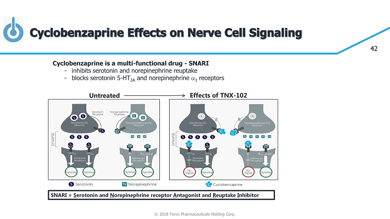 © 2018 Tonix Pharmaceuticals Holding Corp. 41 TNX - 102 SL – Multi - Functional Mechanism Involves Antagonism at 3 Neuronal Receptors Active ingredient, cyclobenzaprine, interacts with 3 receptors • Antagonist at 5 - HT 2A receptors • Similar activity to trazodone and Nuplazid ® ( pimivanserin ) • Antagonist at a 1 - adrenergic receptor • Similar activity to prazosin • Antagonist at histamine H 1 receptors • Similar activity to Benadryl ® (diphenhydramine) and hydroxyzine Multi - functional activity suggests potential for other indications • TNX - 102 SL was developed for the management of fibromyalgia (Phase 3) • Sleep quality is a problem in other conditions