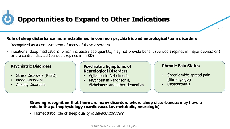 © 2018 Tonix Pharmaceuticals Holding Corp. 43 Tonmya Trazodone Trazodone (disordered sleep ), prazosin (night terrors) - Trazodone inhibits serotonin 5HT 2A receptors and serotonin reuptake (SARI) - Prazosin blocks norepinephrine a 1 receptors Prazosin SARI – S erotonin Receptor A ntagonist & R euptake I nhibitor (Stahl SM, CNS Spectrums, 2009;14:536).