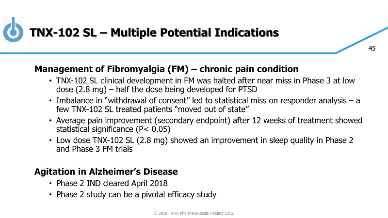 © 2018 Tonix Pharmaceuticals Holding Corp. 44 v Opportunities to Expand to Other Indications Growing recognition that there are many disorders where sleep disturbances may have a role in the pathophysiology (cardiovascular, metabolic, neurologic) • Homeostatic role of sleep quality in several disorders Psychiatric Disorders • Stress Disorders (PTSD) • Mood Disorders • Anxiety Disorders Chronic Pain States • Chronic wide - spread pain (fibromyalgia) • Osteoarthritis Role of sleep disturbance more established in common psychiatric and neurological/pain disorders • Recognized as a core symptom of many of these disorders • Traditional sleep medications, which increase sleep quantity, may not provide benefit (benzodiazepines in major depression) or are contraindicated (benzodiazepines in PTSD) v Psychiatric Symptoms of Neurological Disorders • Agitation in Alzheimer’s • Psychosis in Parkinson’s, Alzheimer’s and other dementias