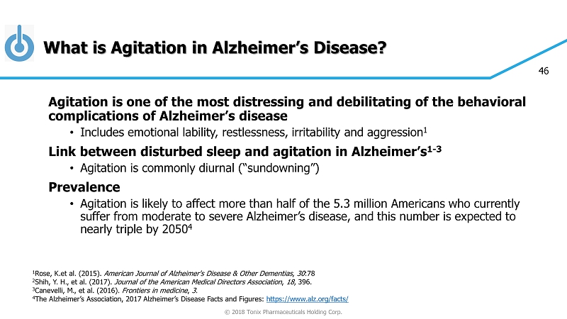 © 2018 Tonix Pharmaceuticals Holding Corp. 45 TNX - 102 SL – Multiple Potential Indications Management of Fibromyalgia (FM) – chronic pain condition • TNX - 102 SL clinical development in FM was halted after near miss in Phase 3 at low dose (2.8 mg) – half the dose being developed for PTSD • Imbalance in “withdrawal of consent” led to statistical miss on responder analysis – a few TNX - 102 SL treated patients “moved out of state” • Average pain improvement (secondary endpoint) after 12 weeks of treatment showed statistical significance (P< 0.05) • Low dose TNX - 102 SL (2.8 mg) showed an improvement in sleep quality in Phase 2 and Phase 3 FM trials Agitation in Alzheimer’s Disease • Phase 2 IND cleared April 2018 • Phase 2 study can be a pivotal efficacy study