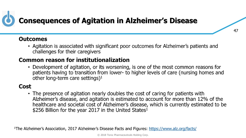 © 2018 Tonix Pharmaceuticals Holding Corp. 46 What is Agitation in Alzheimer’s Disease? Agitation is one of the most distressing and debilitating of the behavioral complications of Alzheimer’s disease • Includes emotional lability, restlessness, irritability and aggression 1 Link between disturbed sleep and agitation in Alzheimer’s 1 - 3 • Agitation is commonly diurnal (“ sundowning ”) Prevalence • Agitation is likely to affect more than half of the 5.3 million Americans who currently suffer from moderate to severe Alzheimer’s disease, and this number is expected to nearly triple by 2050 4 1 Rose, K.et al. (2015). American Journal of Alzheimer's Disease & Other Dementias , 30 :78 2 Shih, Y. H., et al. (2017). Journal of the American Medical Directors Association , 18 , 396. 3 Canevelli, M., et al. (2016). Frontiers in medicine , 3 . 4 The Alzheimer’s Association, 2017 Alzheimer’s Disease Facts and Figures: https://www.alz.org/facts/