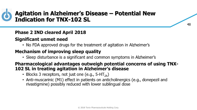 © 2018 Tonix Pharmaceuticals Holding Corp. 47 Consequences of Agitation in Alzheimer’s Disease Outcomes • Agitation is associated with significant poor outcomes for Alzheimer’s patients and challenges for their caregivers Common reason for institutionalization • Development of agitation, or its worsening, is one of the most common reasons for patients having to transition from lower - to higher levels of care (nursing homes and other long - term care settings) 1 Cost • The presence of agitation nearly doubles the cost of caring for patients with Alzheimer’s disease, and agitation is estimated to account for more than 12% of the healthcare and societal cost of Alzheimer’s disease, which is currently estimated to be $256 Billion for the year 2017 in the United States 1 1 The Alzheimer’s Association, 2017 Alzheimer’s Disease Facts and Figures: https://www.alz.org/facts/