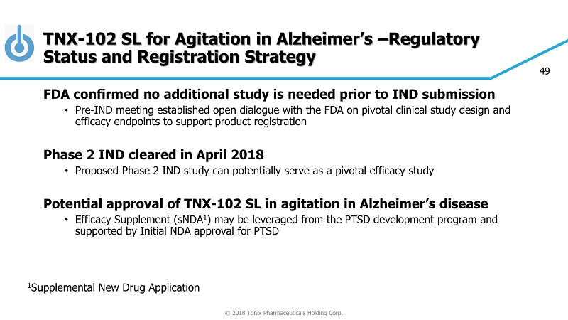 © 2018 Tonix Pharmaceuticals Holding Corp. 48 Agitation in Alzheimer’s Disease – Potential New Indication for TNX - 102 SL Phase 2 IND cleared April 2018 Significant unmet need • No FDA approved drugs for the treatment of agitation in Alzheimer’s Mechanism of improving sleep quality • Sleep disturbance is a significant and common symptoms in Alzheimer’s Pharmacological advantages outweigh potential concerns of using TNX - 102 SL in treating agitation in Alzheimer’s disease • Blocks 3 receptors, not just one (e.g., 5 - HT 2A ) • Anti - muscarinic (M1) effect in patients on anticholinergics (e.g., donepezil and rivastigmine) possibly reduced with lower sublingual dose