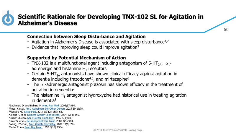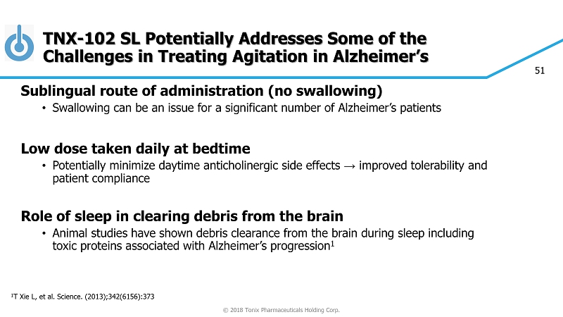 © 2018 Tonix Pharmaceuticals Holding Corp. 50 Scientific Rationale for Developing TNX - 102 SL for Agitation in Alzheimer’s Disease Connection between Sleep Disturbance and Agitation • Agitation in Alzheimer’s Disease is associated with sleep disturbance 1,2 • Evidence that improving sleep could improve agitation 3 Supported by Potential Mechanism of Action • TNX - 102 is a multifunctional agent including antagonism of 5 - HT 2A , a 1 - adrenergic and histamine H 1 receptors • Certain 5 - HT 2A antagonists have shown clinical efficacy against agitation in dementia including trazodone 4,5 , and mirtazapine 6 • The a 1 - adrenergic antagonist prazosin has shown efficacy in the treatment of agitation in dementia 7 • The histamine H 1 antagonist hydroxyzine had historical use in treating agitation in dementia 8 1 Bachmen, D. and Rabins , P. Annu Rev Med. 2006;57:499. 2 Rose, K et al. Am J Alzheimers Dis Other Demen . 2015 30(1):78. 3 Figueiro MG Sleep Med. 2014 15(12):1554 - 64. 4 Lebert F. et al. Dement Geriatr Cogn Disord . 2004:17(4):355. 5 Sulzer DL et al. Am J Geriatr Psychiatry. 1997 5(1):60. 6 Cakir S. et el., Neuropsychiatr Dis Treat. 2008 4(5):963. 7 Wang, LY et al., Am J Geriatr Psychiatry. 2009 17(9):744 8 Settel E. Am Pract Dig Treat. 1957 8(10):1584.