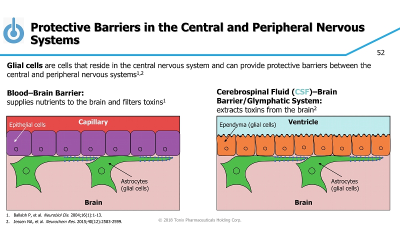 © 2018 Tonix Pharmaceuticals Holding Corp. Protective Barriers in the Central and Peripheral Nervous Systems Glial cells are cells that reside in the central nervous system and can provide protective barriers between the central and peripheral nervous systems 1,2 Blood – Brain Barrier: supplies nutrients to the brain and filters toxins 1 Cerebrospinal Fluid ( CSF ) – Brain Barrier/Glymphatic System: extracts toxins from the brain 2 Ventricle Brain Ependyma (glial cells) Astrocytes (glial cells) Capillary Brain Epithelial cells Astrocytes (glial cells) 1. Ballabh P, et al. Neurobiol Dis. 2004;16(1):1 - 13. 2. Jessen NA, et al. Neurochem Res. 2015;40(12):2583 - 2599. 52
