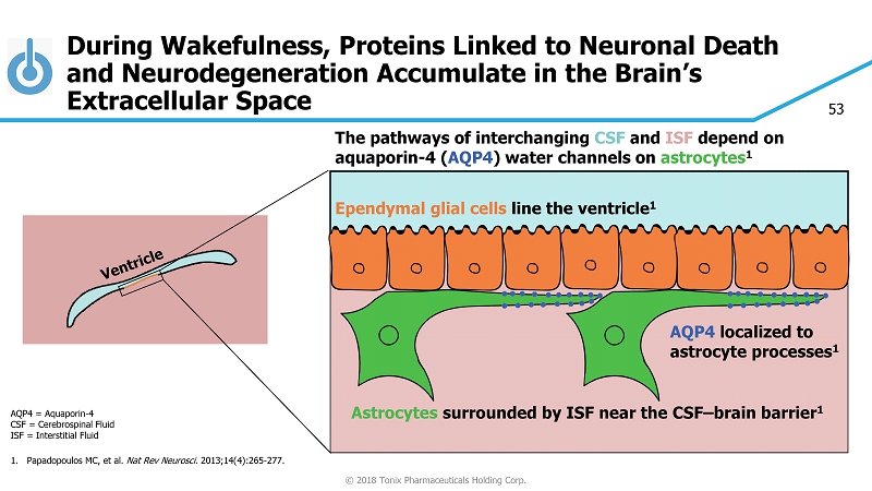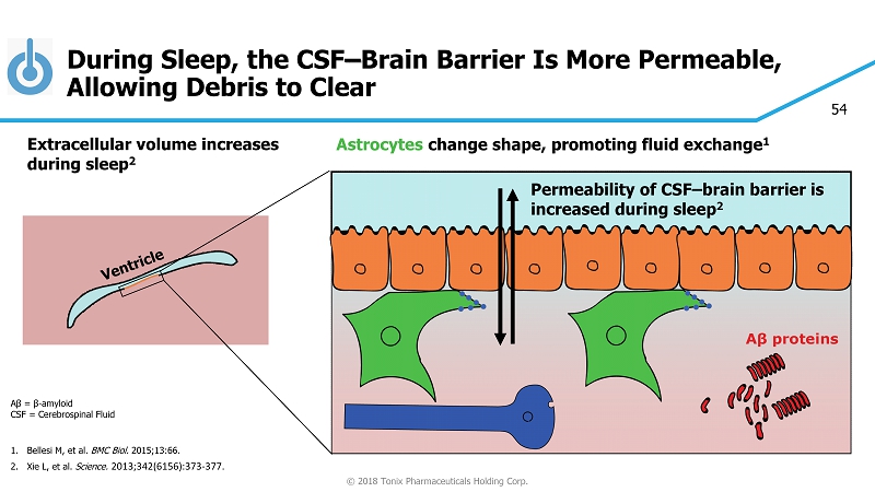© 2018 Tonix Pharmaceuticals Holding Corp. 53 During Wakefulness, Proteins Linked to Neuronal Death and Neurodegeneration Accumulate in the Brain’s Extracellular Space AQP4 = A quaporin - 4 CSF = Cerebrospinal Fluid ISF = Interstitial Fluid 1. Papadopoulos MC, et al. Nat Rev Neurosci . 2013;14(4):265 - 277. Ependymal glial cells line the ventricle 1 AQP4 localized to astrocyte processes 1 Astrocytes surrounded by ISF near the CSF – brain barrier 1 The pathways of interchanging CSF and ISF depend on aquaporin - 4 ( AQP4 ) water channels on astrocytes 1