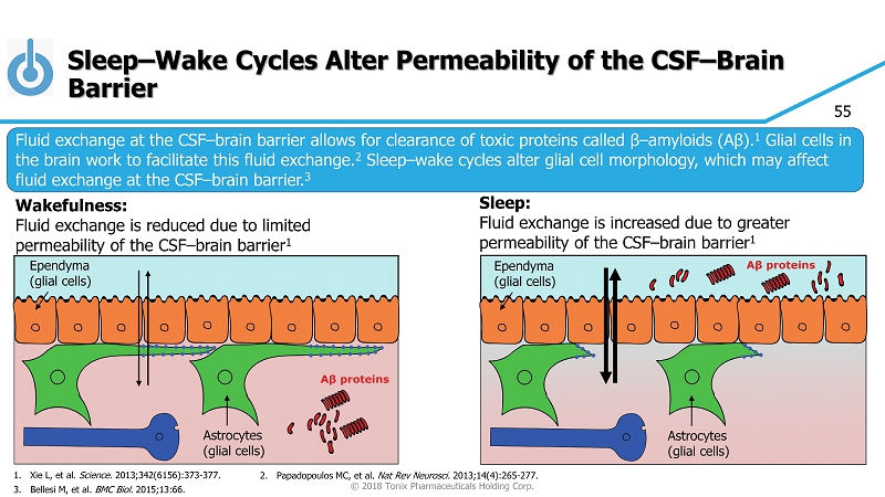 © 2018 Tonix Pharmaceuticals Holding Corp. 54 During Sleep, the CSF – Brain Barrier Is More Permeable, Allowing Debris to Clear Aβ = β - amyloid CSF = Cerebrospinal Fluid 1. Bellesi M, et al. BMC Biol. 2015;13:66. 2. Xie L, et al. Science. 2013;342(6156):373 - 377. Permeability of CSF – brain barrier is increased during sleep 2 Astrocytes change shape, promoting fluid exchange 1 Extracellular volume increases during sleep 2