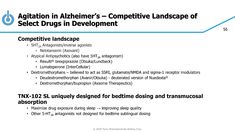 © 2018 Tonix Pharmaceuticals Holding Corp. 56 Agitation in Alzheimer’s – Competitive Landscape of Select Drugs in Development Competitive landscape • 5HT 2A Antagonists/inverse agonists • Nelotanserin ( Axovant ) • Atypical Antip sychotics (also have 5HT 2A antagonism) • Rexulti ® brexpiprazole (Otsuka/ Lundbeck ) • Lumateperone ( InterCellular ) • Dextromethorphans – believed to act as SSRI, glutamate/NMDA and sigma - 1 receptor modulators • Deudextromethorphan ( Avanir /Otsuka) - deuterated version of Nuedexta ® • Dextromethorphan/bupropion ( Axsome Therapeutics) TNX - 102 SL uniquely designed for bedtime dosing and transmucosal absorption • Maximize drug exposure during sleep → improving sleep quality • Other 5 - HT 2A antagonists not designed for bedtime sublingual dosing