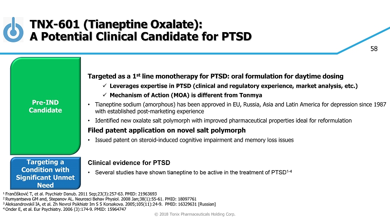 © 2018 Tonix Pharmaceuticals Holding Corp. 57 Candidates in Development Preclinical Phase 2 NDA 1 /BLA 2 Market Pipeline Product Indication/D escription Phase 3 Tonmya Bedtime Treatment for PTSD Daytime Treatment for PTSD TNX - 601 Novel polymorph and salt discovered and characterized TNX - 801 Horsepox virus synthesized and demonstrated protective vaccine activity in mice Smallpox - preventing vaccine Cyclobenzaprine HCl sublingual tablets Tianeptine oxalate oral formulation Live horsepox virus (HPXV) vaccine from cell culture Phase 1 1 NDA - New Drug Application; 2 BLA – Biologic Licensing Application; 3 Investigational New Drug Application Bedtime Treatment for Agitation in Alzheimer’s Cyclobenzaprine HCl sublingual tablets Phase 2 IND 3 cleared 2Q2018 TNX - 102 SL All programs owned outright with no royalties or other obligations due Phase 3 development (new pivotal efficacy study to be discussed with FDA)