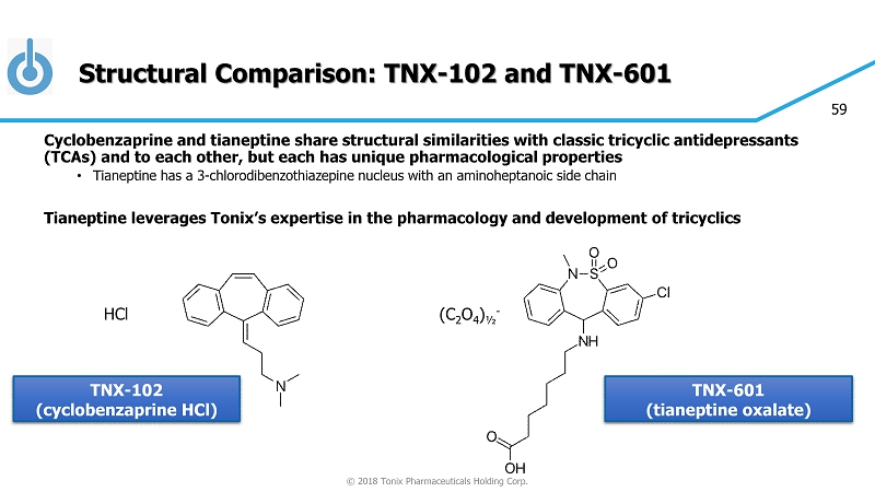 © 2018 Tonix Pharmaceuticals Holding Corp. 58 TNX - 601 ( Tianeptine Oxalate): A Potential Clinical Candidate for PTSD Pre - IND Candidate Targeted as a 1 st line monotherapy for PTSD: oral formulation for daytime dosing x Leverages expertise in PTSD (clinical and regulatory experience, market analysis, etc.) x Mechanism of Action (MOA) is different from Tonmya • Tianeptine sodium (amorphous) has been approved in EU, Russia, Asia and Latin America for depression since 1987 with established post - marketing experience • Identified new oxalate salt polymorph with improved pharmaceutical properties ideal for reformulation Filed patent application on novel salt polymorph • Issued patent on steroid - induced cognitive impairment and memory loss issues Targeting a Condition with Significant Unmet Need Clinical evidence for PTSD • Several studies have shown tianeptine to be active in the treatment of PTSD 1 - 4 1 Frančišković T, et al. Psychiatr Danub . 2011 Sep;23(3):257 - 63. PMID: 21963693 2 Rumyantseva GM and, Stepanov AL. Neurosci Behav Physiol. 2008 Jan;38(1):55 - 61. PMID: 18097761 3 Aleksandrovskiĭ IA, et al. Zh Nevrol Psikhiatr Im S S Korsakova . 2005;105(11):24 - 9. PMID: 16329631 [Russian] 4 Onder E, et al. Eur Psychiatry. 2006 (3):174 - 9. PMID: 15964747