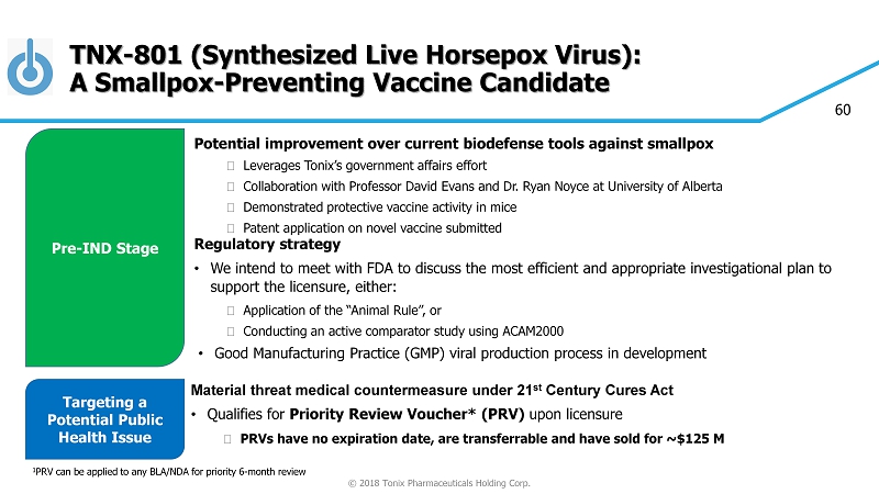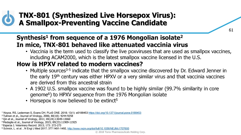 © 2018 Tonix Pharmaceuticals Holding Corp. 60 TNX - 801 (Synthesized Live Horsepox Virus): A Smallpox - Preventing Vaccine Candidate Pre - IND Stage Potential improvement over current biodefense tools against smallpox ✓ Leverages Tonix’s government affairs effort ✓ Collaboration with Professor David Evans and Dr. Ryan Noyce at University of Alberta ✓ Demonstrated protective vaccine activity in mice ✓ Patent application on novel vaccine submitted Regulatory strategy • We intend to meet with FDA to discuss the most efficient and appropriate investigational plan to support the licensure, either: ✓ Application of the “Animal Rule”, or ✓ Conducting an active comparator study using ACAM2000 • Good Manufacturing Practice (GMP) viral production process in development Targeting a Potential Public Health Issue Material threat medical countermeasure under 21 st Century Cures Act • Qualifies for Priority Review Voucher* (PRV) upon licensure ✓ PRVs have no expiration date, are transferrable and have sold for ~$125 M 1 PRV can be applied to any BLA/NDA for priority 6 - month review