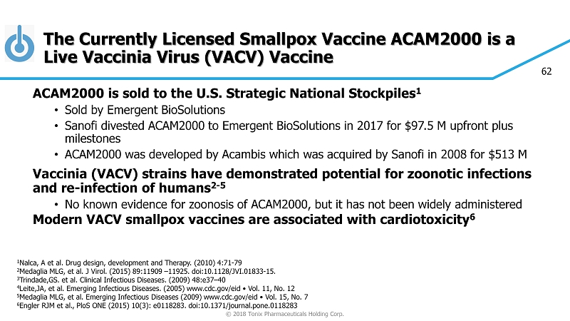 © 2018 Tonix Pharmaceuticals Holding Corp. 62 ACAM2000 is sold to the U.S. Strategic National Stockpiles 1 • Sold by Emergent BioSolutions • Sanofi divested ACAM2000 to Emergent BioSolutions in 2017 for $97.5 M upfront plus milestones • ACAM2000 was developed by Acambis which was acquired by Sanofi in 2008 for $513 M Vaccinia (VACV) strains have demonstrated potential for zoonotic infections and re - infection of humans 2 - 5 • No known evidence for zoonosis of ACAM2000, but it has not been widely administered Modern VACV smallpox vaccines are associated with cardiotoxicity 6 The Currently Licensed Smallpox Vaccine ACAM2000 is a Live Vaccinia Virus (VACV) Vaccine 1 Nalca, A et al. Drug design, development and Therapy. (2010) 4:71 - 79 2 Medaglia MLG, et al. J Virol . (2015) 89:11909 – 11925. doi:10.1128/JVI.01833 - 15. 3 Trindade,GS. et al. Clinical Infectious Diseases. (2009) 48:e37 – 40 4 Leite,JA, et al. Emerging Infectious Diseases. (2005) www.cdc.gov/eid • Vol. 11, No. 12 5 Medaglia MLG, et al. Emerging Infectious Diseases (2009) www.cdc.gov/eid • Vol. 15, No. 7 6 Engler RJM et al., PloS ONE (2015) 10(3): e0118283. doi:10.1371/journal.pone.0118283
