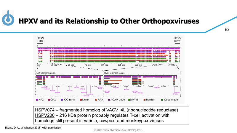 63 © 2018 Tonix Pharmaceuticals Holding Corp. HSPV074 – fragmented homolog of VACV I4L (ribonucleotide reductase) HSPV200 – 216 kDa protein probably regulates T - cell activation with homologs still present in variola , cowpox, and monkeypox viruses HPXV and its Relationship to Other Orthopoxviruses Evans, D. U. of Alberta (2018) with permission