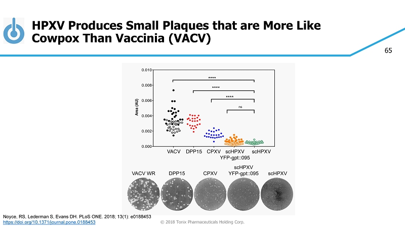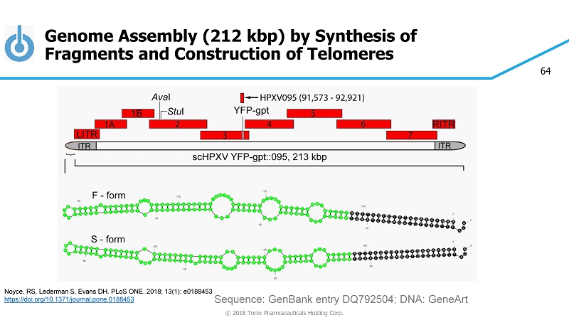 64 © 2018 Tonix Pharmaceuticals Holding Corp. Sequence: GenBank entry DQ792504; DNA: GeneArt Genome Assembly (212 kbp ) by Synthesis of Fragments and Construction of Telomeres Noyce, RS, Lederman S, Evans DH. PLoS ONE. 2018; 13(1): e0188453 https://doi.org/10.1371/journal.pone.0188453