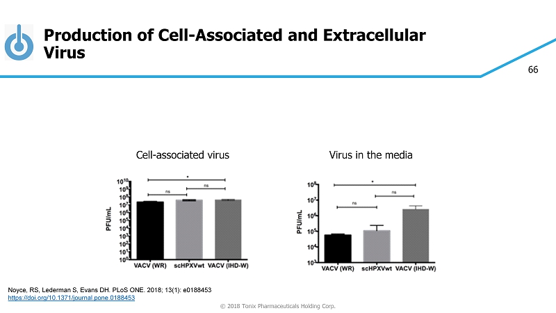 65 © 2018 Tonix Pharmaceuticals Holding Corp. HPXV Produces Small Plaques that are More Like Cowpox Than Vaccinia (VACV) Noyce, RS, Lederman S, Evans DH. PLoS ONE. 2018; 13(1): e0188453 https://doi.org/10.1371/journal.pone.0188453