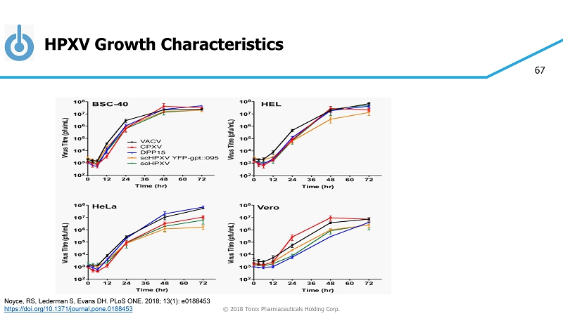 67 © 2018 Tonix Pharmaceuticals Holding Corp. HPXV Growth Characteristics Noyce, RS, Lederman S, Evans DH. PLoS ONE. 2018; 13(1): e0188453 https://doi.org/10.1371/journal.pone.0188453