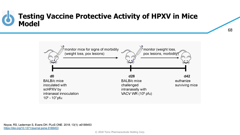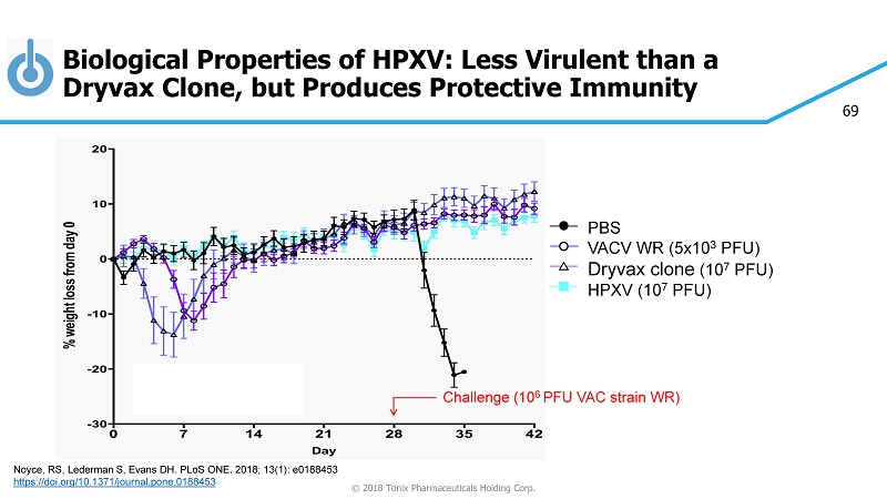 68 © 2018 Tonix Pharmaceuticals Holding Corp. Testing Vaccine Protective Activity of HPXV in Mice Model Noyce, RS, Lederman S, Evans DH. PLoS ONE. 2018; 13(1): e0188453 https://doi.org/10.1371/journal.pone.0188453