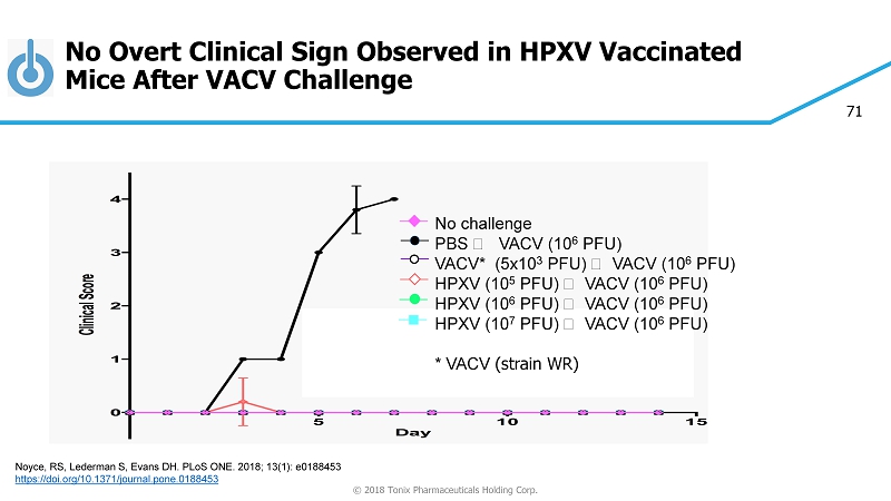 70 © 2018 Tonix Pharmaceuticals Holding Corp. PBS HPXV (10 5 PFU) HPXV (10 6 PFU) HPXV (10 7 PFU) Challenge (10 6 PFU VAC strain WR) HPXV Vaccine Protection Activity Observed As Low As 10 5 PFU* *PFU = plaque forming units Noyce, RS, Lederman S, Evans DH. PLoS ONE. 2018; 13(1): e0188453 https://doi.org/10.1371/journal.pone.0188453