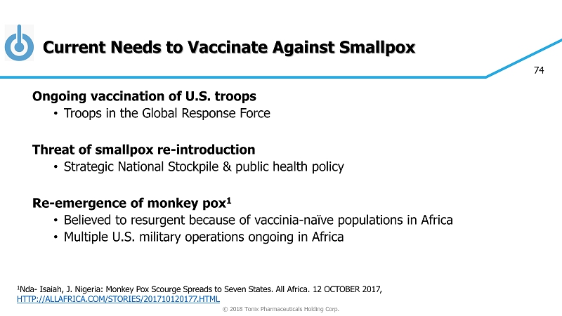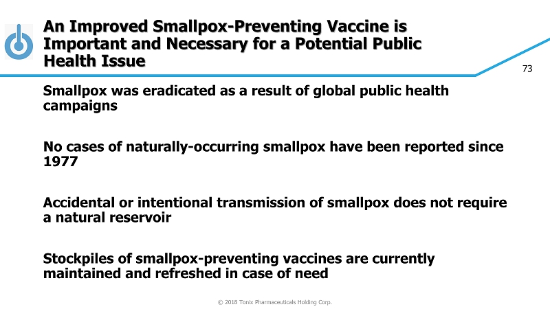 © 2018 Tonix Pharmaceuticals Holding Corp. 73 An Improved Smallpox - Preventing Vaccine is Important and Necessary for a Potential Public Health Issue Smallpox was eradicated as a result of global public health campaigns No cases of naturally - occurring smallpox have been reported since 1977 Accidental or intentional transmission of smallpox does not require a natural reservoir Stockpiles of smallpox - preventing vaccines are currently maintained and refreshed in case of need