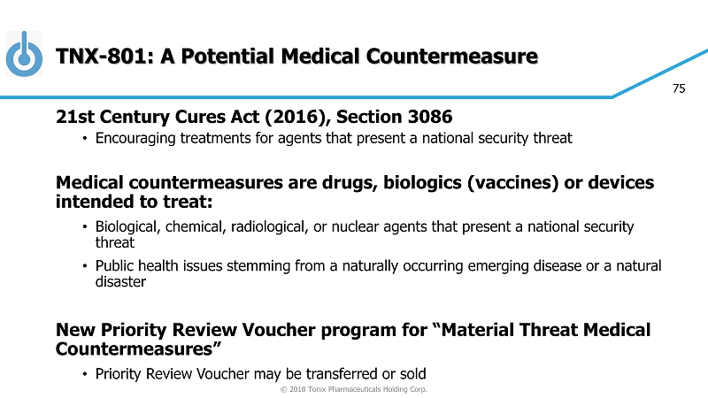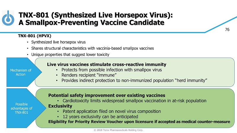 © 2018 Tonix Pharmaceuticals Holding Corp. 75 TNX - 801: A Potential Medical Countermeasure 21st Century Cures Act (2016), Section 3086 • Encouraging treatments for agents that present a national security threat Medical countermeasures are drugs, biologics (vaccines) or devices intended to treat: • Biological, chemical, radiological, or nuclear agents that present a national security threat • Public health issues stemming from a naturally occurring emerging disease or a natural disaster New Priority Review Voucher program for “Material Threat Medical Countermeasures” • Priority Review Voucher may be transferred or sold