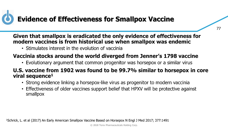 © 2018 Tonix Pharmaceuticals Holding Corp. 76 Live virus vaccines stimulate cross - reactive immunity • Protects from possible infection with smallpox virus • Renders recipient “immune” • Provides indirect protection to non - immunized population “herd immunity” Potential safety improvement over existing vaccines • Cardiotoxicity limits widespread smallpox vaccination in at - risk population Exclusivity • Patent application filed on novel virus composition • 12 years exclusivity can be anticipated Eligibility for Priority Review Voucher upon licensure if accepted as medical counter - measure Mechanism of Action Possible advantages of TNX - 801 TNX - 801 (HPVX) • Synthesized live horsepox virus • Shares structural characteristics with vaccinia - based smallpox vaccines • Unique properties that suggest lower toxicity TNX - 801 (Synthesized Live Horsepox Virus): A Smallpox - Preventing Vaccine Candidate